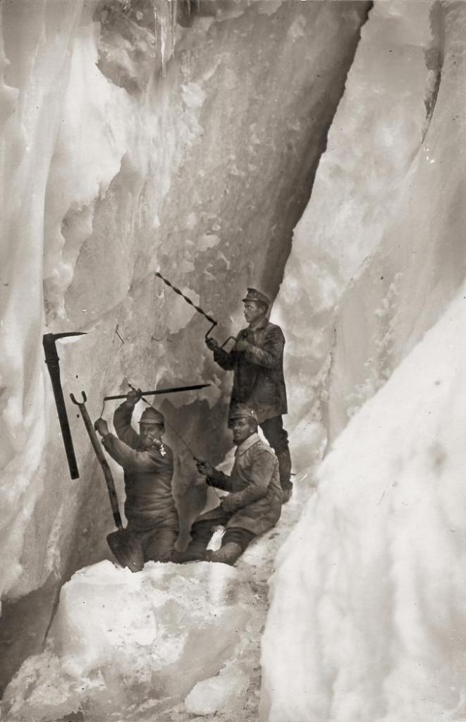 In the winter, the trenches were built with snow and into the ice. The Marmolada, the highest peak in the Dolomites, was the site of a year-round “ice-city” where both sides dug into a glacier. The Austrian Corps of Engineers dug an entire “ice city”—a complex of tunnels, dormitories, and storerooms—out of the glacier. Soldiers had to drill holes into the ice to place explosives and begin the massive task of digging a tunnel under enemy lines.