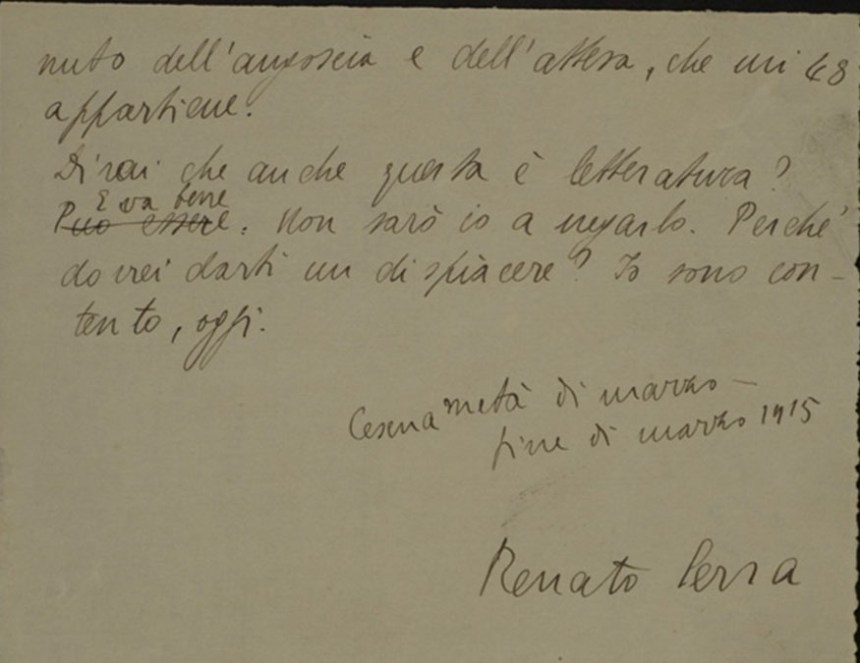 There is no writing for these moments and these sensations that cannot reach the consistency of the “fact.” Not even Tolstoi was able to give a complete representation of these instants in which reality appears to Serra “naked and silent” and in which the war seems dominated by “something